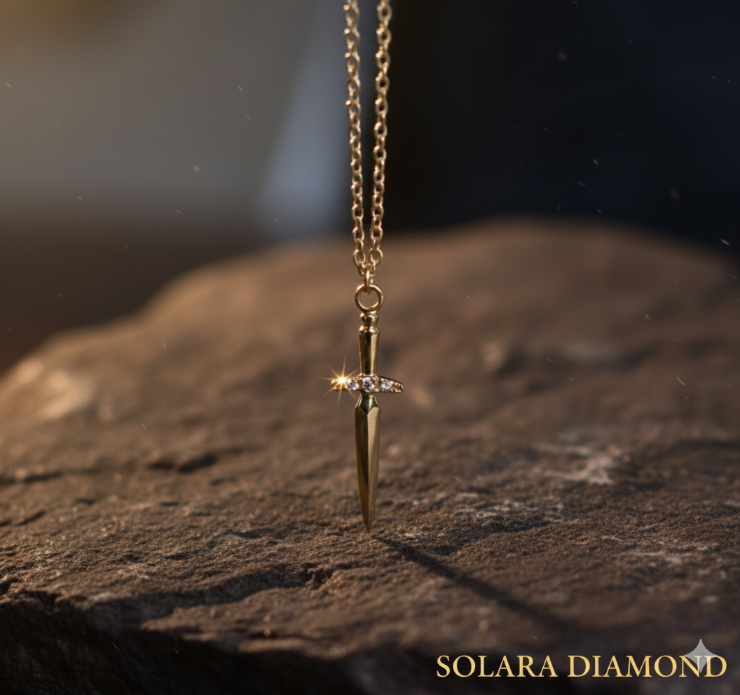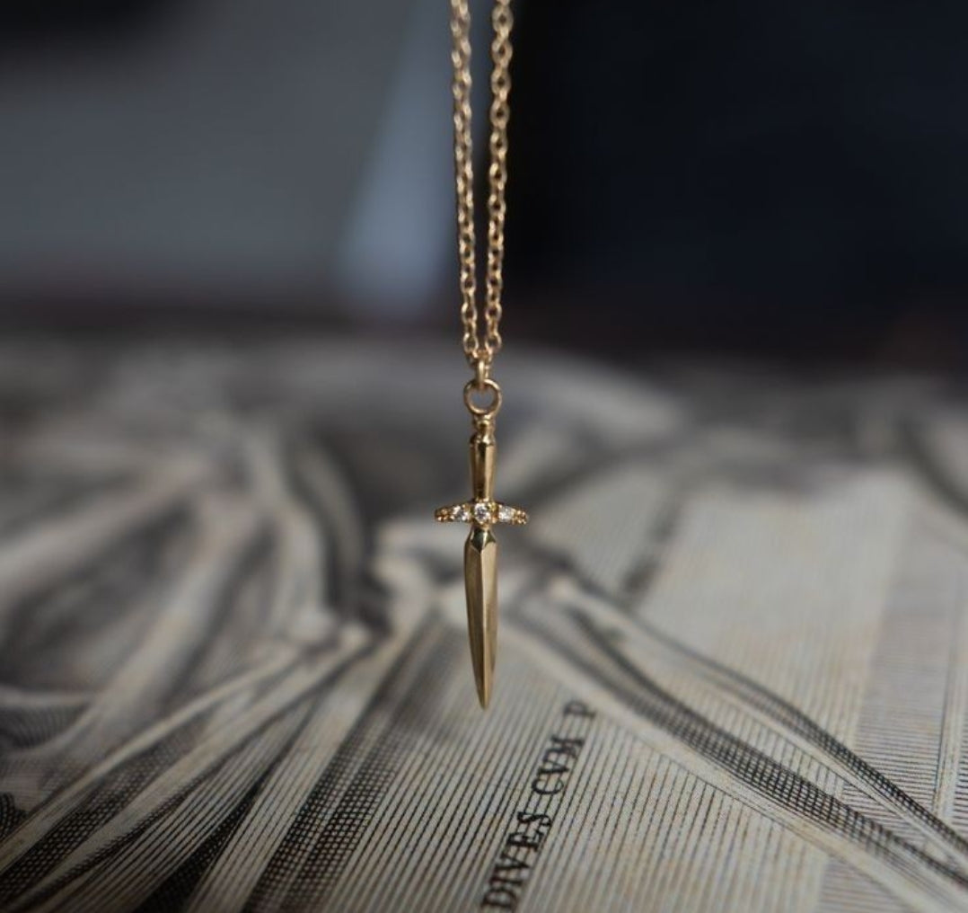 This necklace features a finely detailed dagger pendant that offers a subtle yet striking edge to your look. The pendant hangs vertically, polished to a warm gold-tone finish, and is accented near the hilt with a trio of simulated diamonds for a touch of unexpected sparkle.