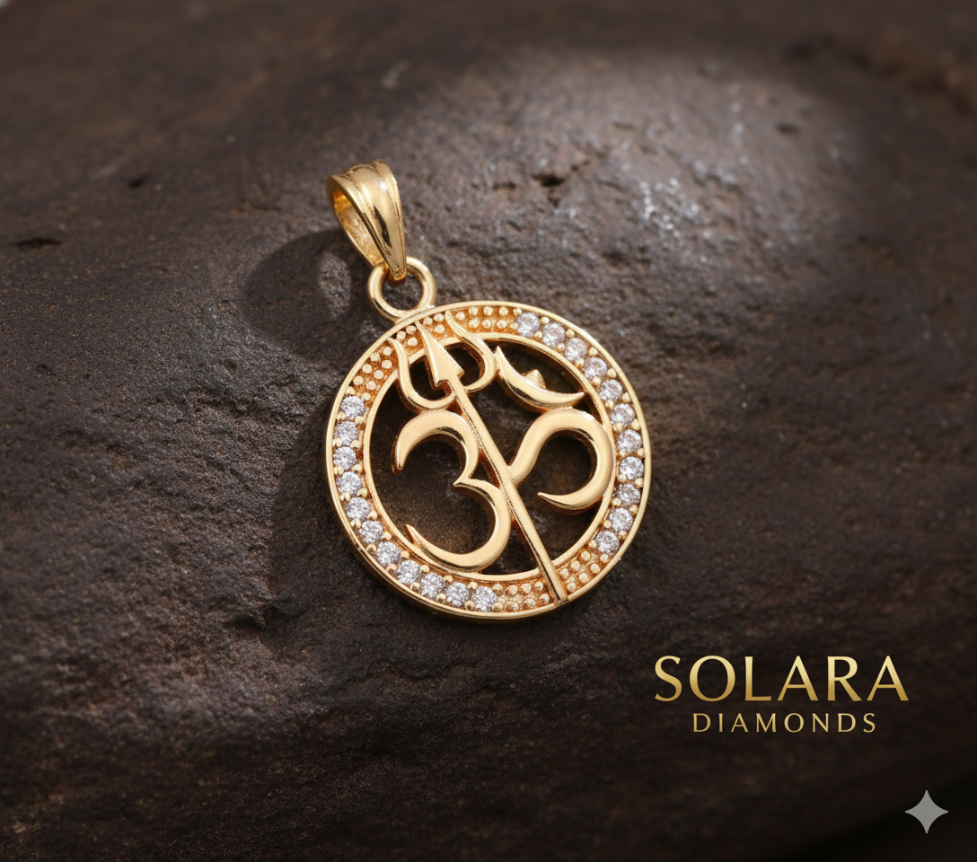 - Frame/Setting: The Om symbol is set within a circular or mandala-like frame. This frame features an inner ring of small, clear stones (likely cubic zirconia or diamonds, given the sparkle) and an ornate outer border with a scalloped or petal-like filigree design.